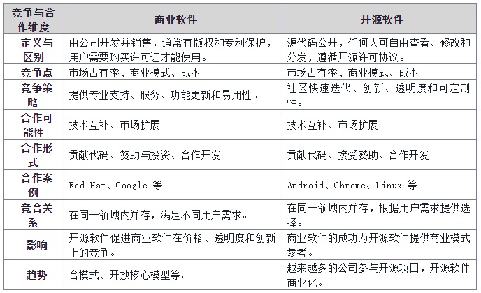 總的來說,商業(yè)軟件與開源軟件之間的競(jìng)爭(zhēng)和合作是軟件行業(yè)的一個(gè)基本特征,它們相互影響、相互促進(jìn),共同推動(dòng)了整個(gè)行業(yè)的發(fā)展和創(chuàng)新。