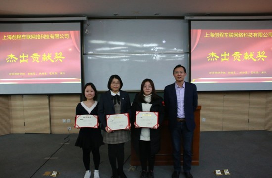 杰出貢獻(xiàn)獎(jiǎng)(從左到右翟曉燕、黃梅霞、周悅、張靜晶(未到)、邱總(頒獎(jiǎng)人員))