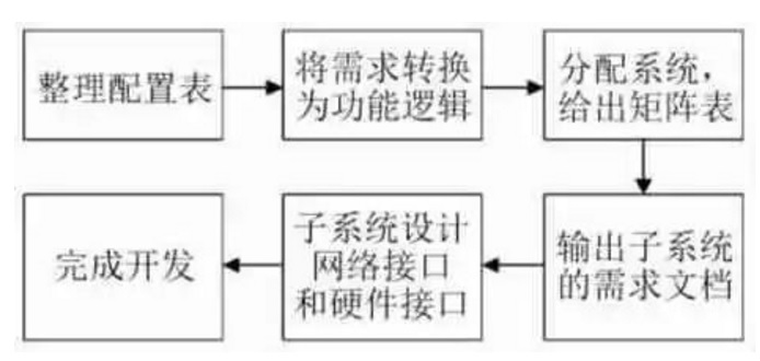 傳統(tǒng)EE架構(gòu)的開發(fā)流程如圖1所示,由市場(chǎng)首先對(duì)車型定位,針對(duì)定位尋找相應(yīng)的或更高配置的主流車型進(jìn)行對(duì)標(biāo),主要對(duì)標(biāo)其外形、內(nèi)飾、靜態(tài)功能和動(dòng)態(tài)功能并牽頭全員填寫競(jìng)品分析表,將分析結(jié)果整合并調(diào)研用戶需求后整理輸出配置表、技術(shù)梳理配置表,找到各自的相關(guān)項(xiàng),轉(zhuǎn)換為技術(shù)方案,將配置表分解為多個(gè)功能邏輯,再將功能邏輯分配給多系統(tǒng),輸出網(wǎng)絡(luò)通信需求表,根據(jù)需求表,輸出子系統(tǒng)的需求文檔,文檔中寫明I/O、人機(jī)交互界面、性能要求、應(yīng)用場(chǎng)景等,子系統(tǒng)根據(jù)功能分配自己的網(wǎng)絡(luò)接口和硬件接口,最后完成系統(tǒng)的原理圖和網(wǎng)絡(luò)開發(fā)。