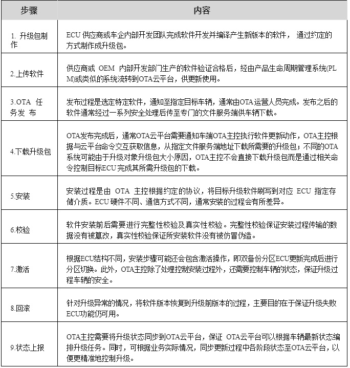 圖2-1 是一個(gè)典型的 OTA 系統(tǒng)框架,包含了三個(gè)基本要素,即云端的 OTA 平臺、車端 OTA 主控、OTA 對象。其中:OTA 云平臺負(fù)責(zé) OTA 升級包管理、車輛管理及 OTA 發(fā)布等功能,車端 OTA 主控負(fù)責(zé)從 OTA 云平臺下載升級包并將其刷寫到目標(biāo) ECU ,OTA 升級對象即最終軟件刷寫的主體,從主控接收軟件并完成自身軟件更新。OTA 的基本實(shí)現(xiàn)流程(圖2-1)可歸納為下表 2-3 所示步驟。
